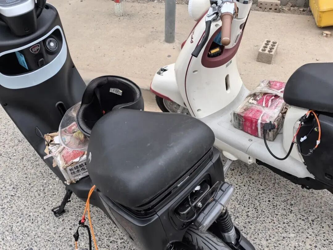 现场“换电过检”几乎已是“明规则”。10时50分,又一车行老板领着两辆“小牛”电动自行车前来上牌,几乎是一样的操作模式,车上原配有的“48V30AH”大锂电被拆在一旁,而用于验车的是一款长条形“48V12AH”小电池,两者大小迥异。或许是临近中午休息时间,车行老板索性就在派出所大院里操作起了改装,换完电池后,只见老板将两只脚踏简单塞入两边的孔洞里,就催促着车主推着去验车。